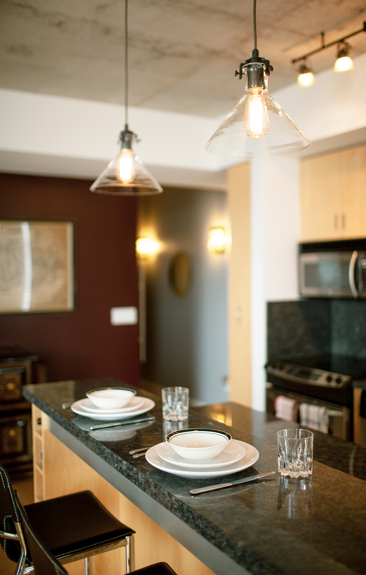 Taking inspiration from the owner's personal collection of art and furniture acquired while living abroad in the Middle East and Africa, the condo mixes bold paint colours, luxe materials, statement furniture and sparse embellishments to compliment the industrial backdrop of the condominium. Bone white is the dominant colour throughout the space, paired with wine red and slate blue feature walls. This palette highlights the warmth and details of the feature furniture pieces. Carefully curated and custom designed furniture - granite top and hairpin leg end tables and a shipping pallet media unit - all work to highlight and compliment the items collected during the client's extensive travels and unite the space, resulting in a warm, bold and comfortable environment.